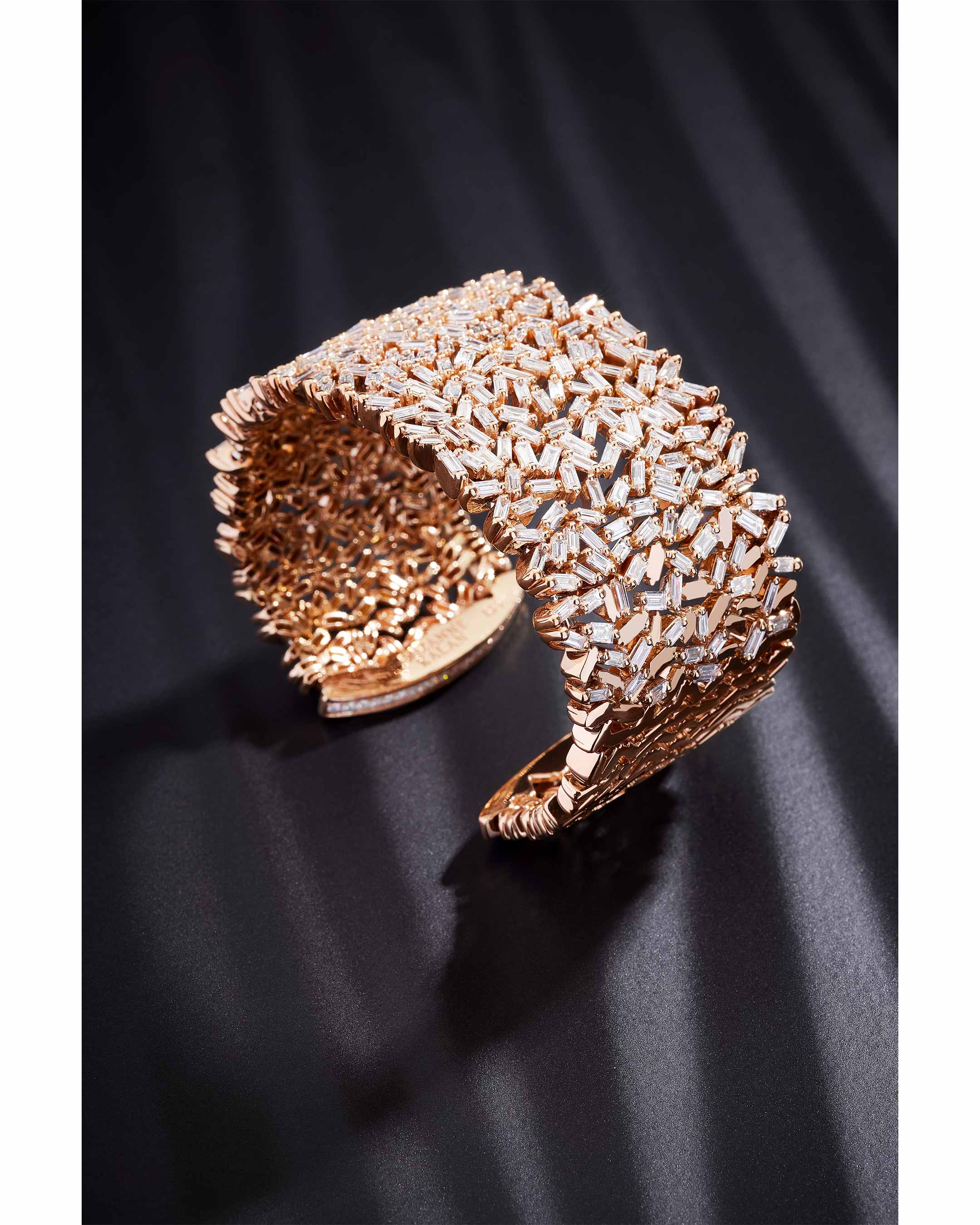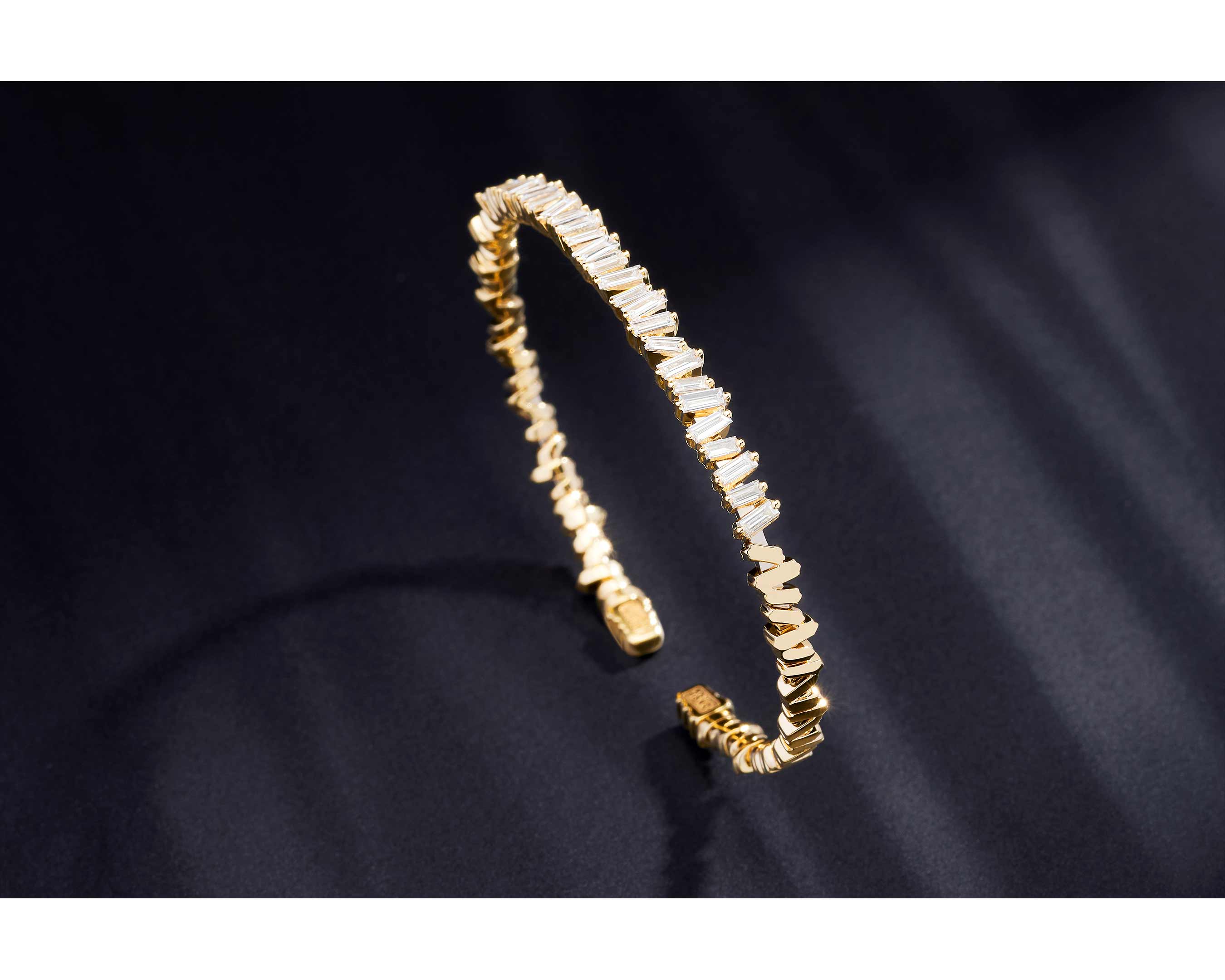 Reflecting on the bangle’s journey, Kalan says, “Baguette diamonds offer an understated yet stunning sparkle that can catch the eye from any direction. I envisioned a diamond explosion, a piece that’s elegant yet fun, subtle yet a conversation starter, a timeless beauty that can be worn every day, yet stand out from across the room.”